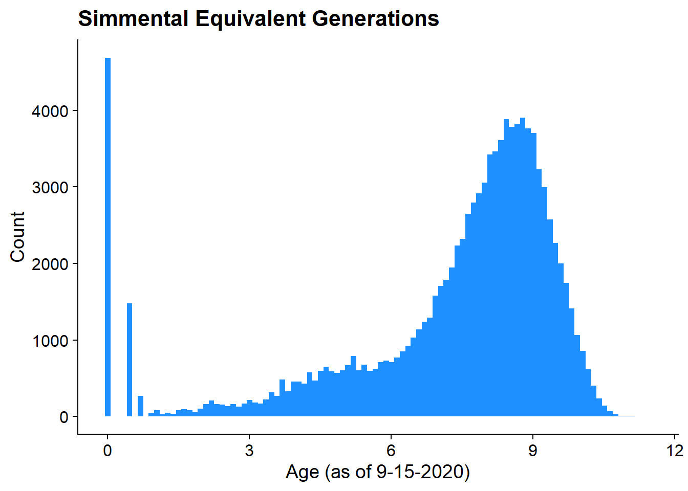 labs(title = "Simmental Equivalent Generations Squared", x = "Age (as of 9-15-2020)", y = "Count")