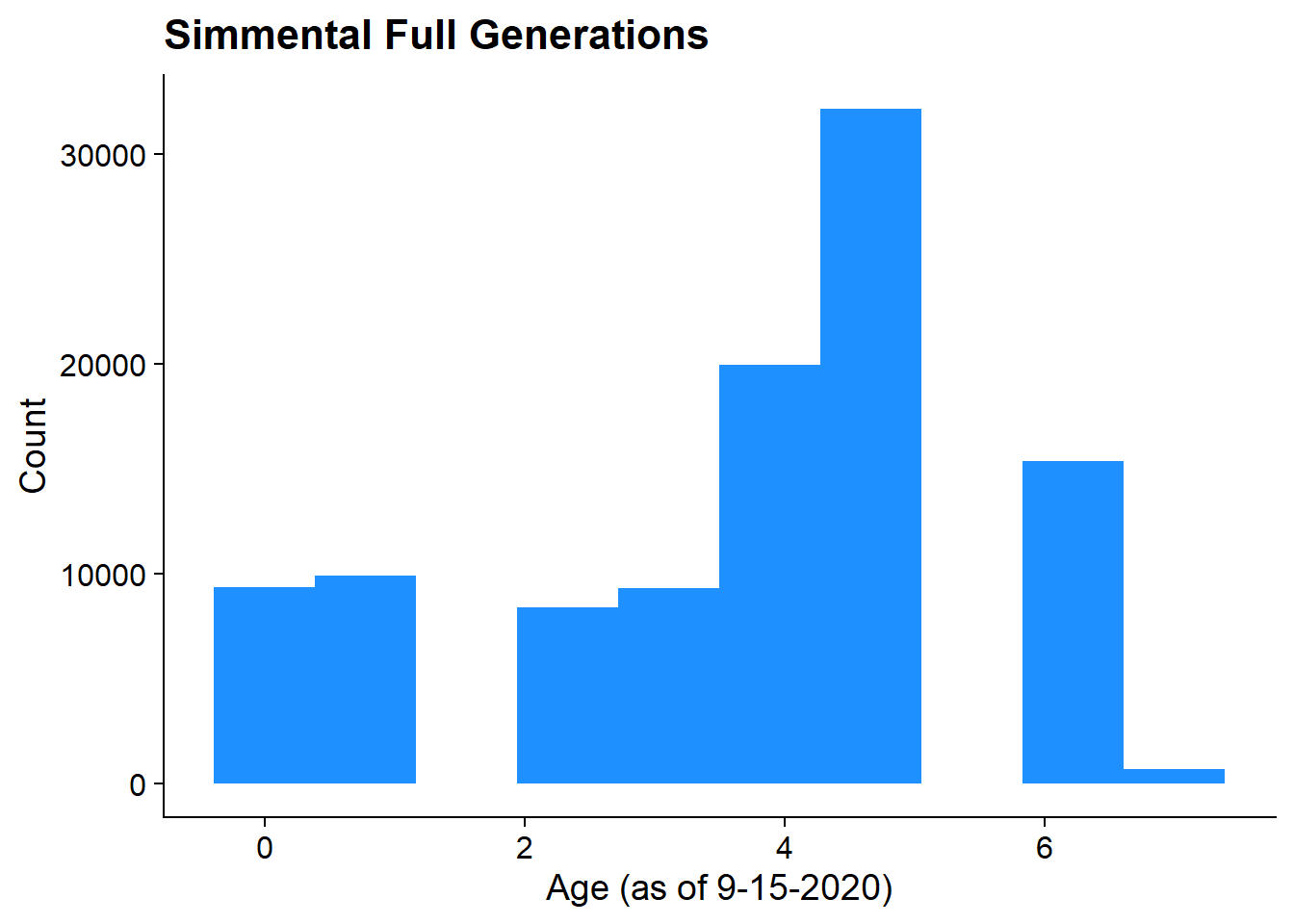 labs(title = "Simmental Full Generations", x = "Age (as of 9-15-2020)", y = "Count")