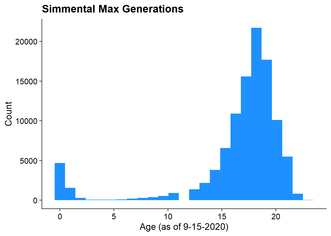 labs(title = "Simmental Max Generations", x = "Age (as of 9-15-2020)", y = "Count")