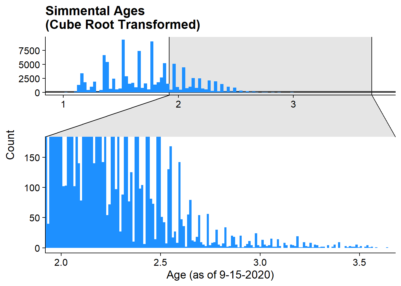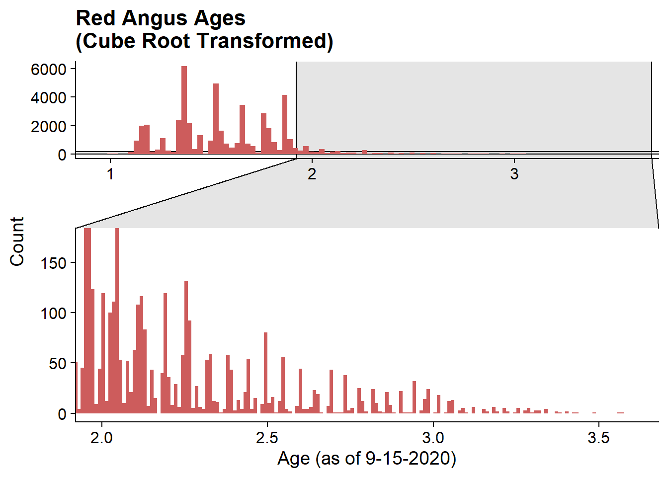 labs(title = "Red Angus Ages\n(Cube Root Transformed)", x = "Age (as of 9-15-2020)", y = "Count")+