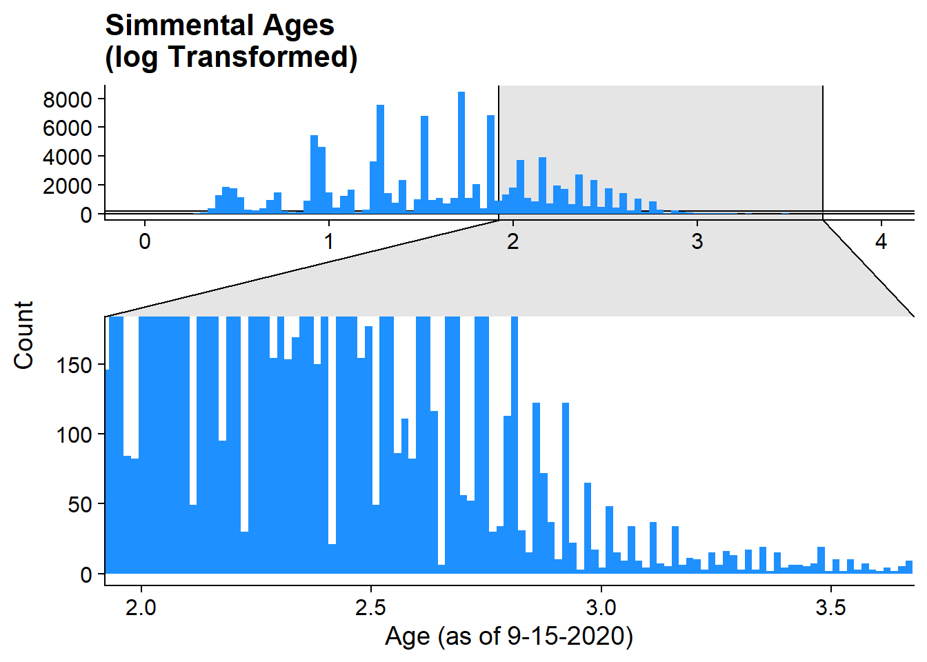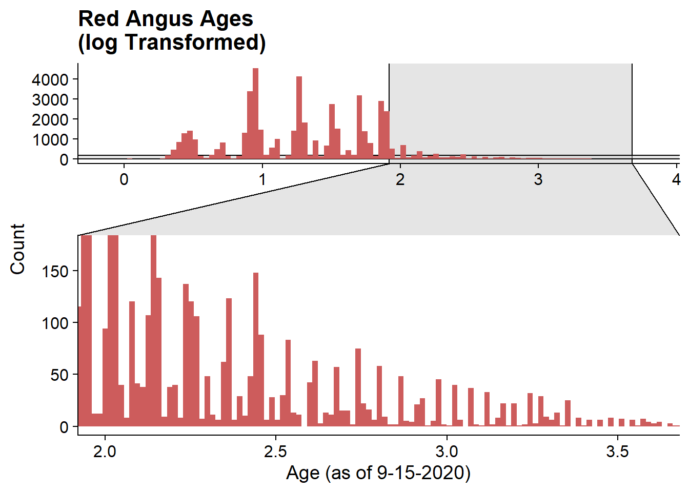 labs(title = "Red Angus Ages\n(log Transformed)", x = "Age (as of 9-15-2020)", y = "Count")+