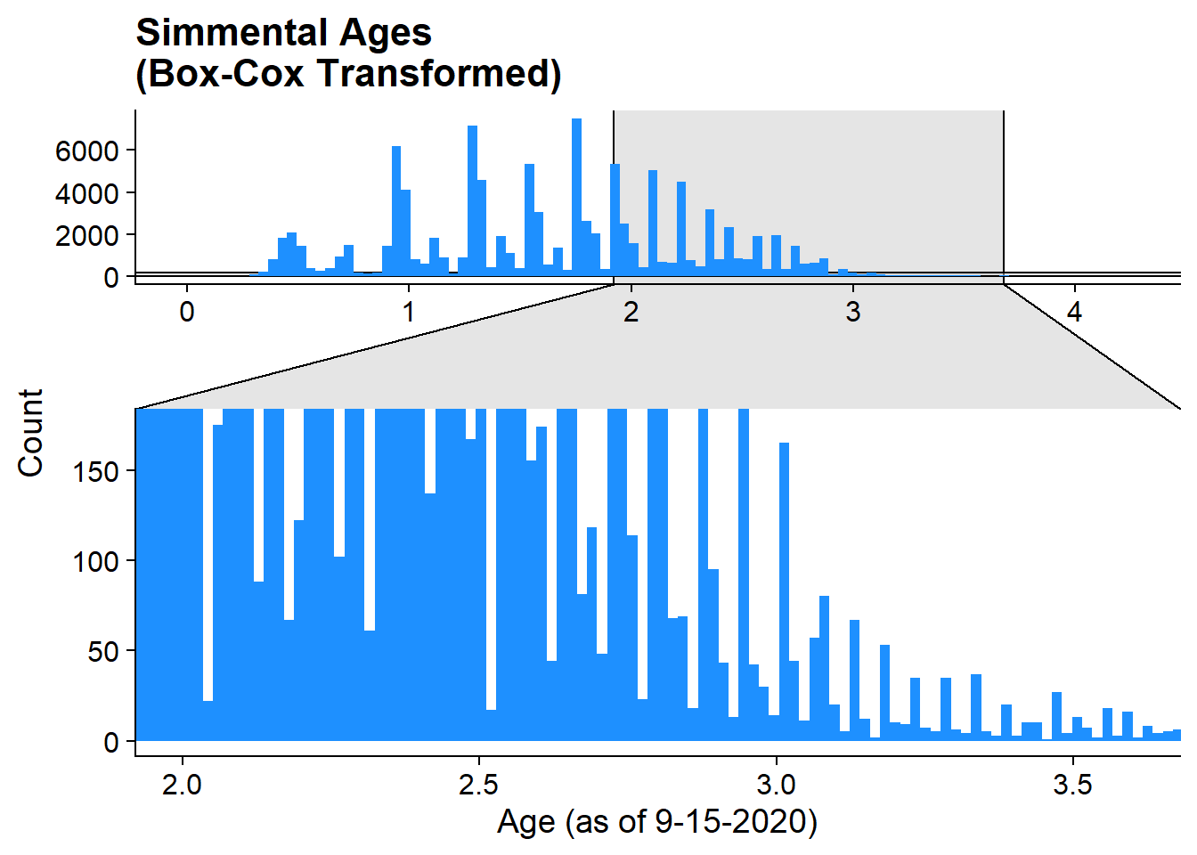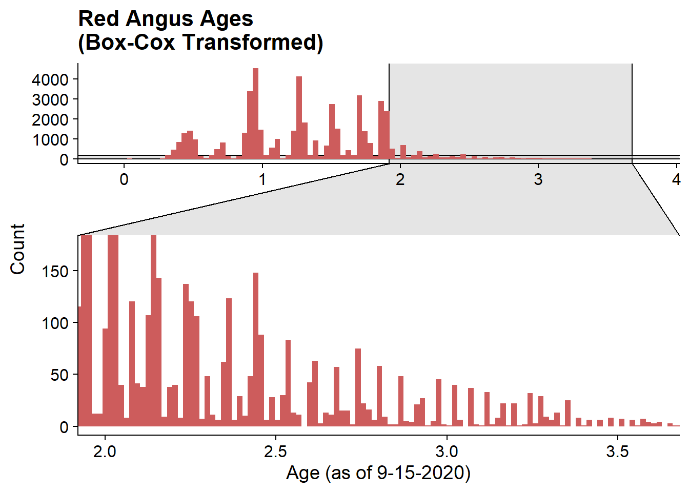 labs(title = "Red Angus Ages\n(Box-Cox Transformed)", x = "Age (as of 9-15-2020)", y = "Count")+