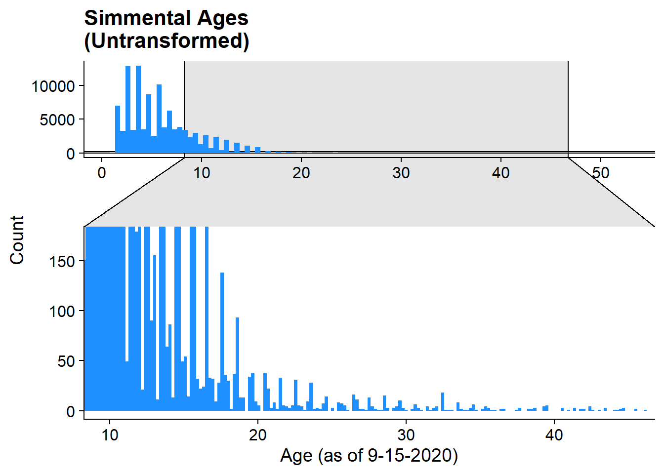 labs(title = "Simmental Ages\n(Untransformed)", x = "Age (as of 9-15-2020)", y = "Count")+