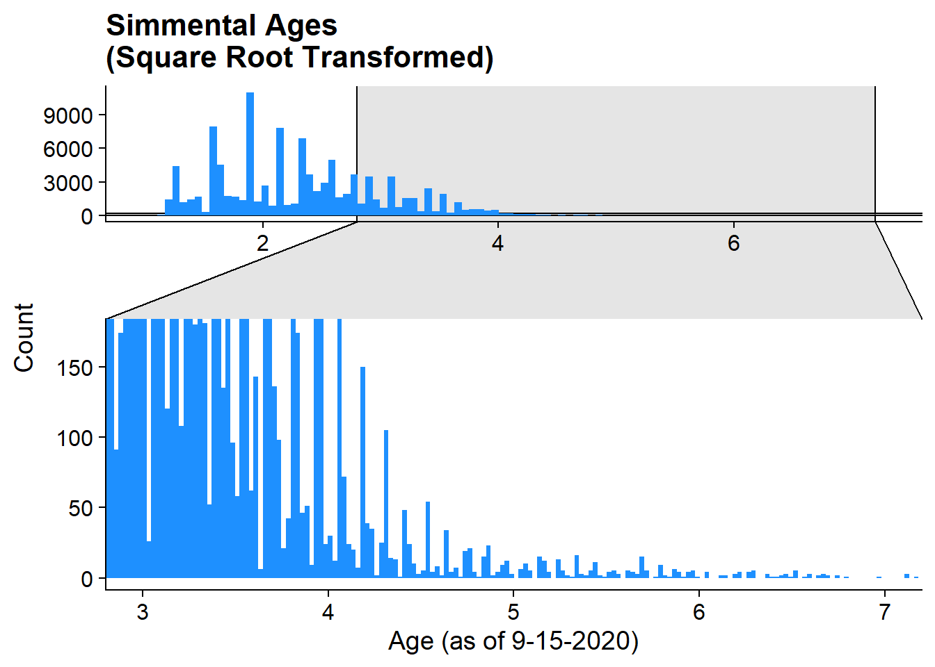 geom_histogram(aes(x = sqrt_age), mutate(simmental, z = TRUE), bins = 250, fill = "dodgerblue")+